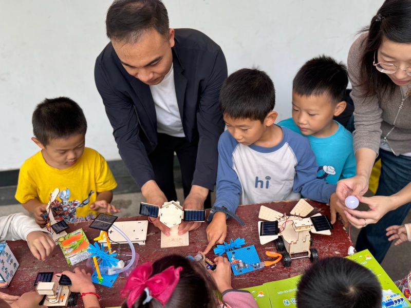 在活动现场,科普团队成员向参与家庭发放了绿色能源科普手册,展示了太阳能发电模型、风力发电模型、水力发电模型等手工作品,科普志愿者通过操作演示与讲解,引导孩子们近距离观察绿色能源发电技术如何将自然之力转化为电能的奇妙过程,在实践中理解能量转换的原理,一个个专注的眼神中闪烁着对科学的好奇与热爱。问答互动环节气氛热烈,孩子们踊跃发言,积极分享自己对绿色未来的想象与期待。家长协助孩子扫码参与绿色能源线上知识竞答,竞赛设置趣味奖励机制,依据答题成绩评选优胜者并颁发奖品,以竞技形式激发孩子们主动学习和深入思考的兴趣。